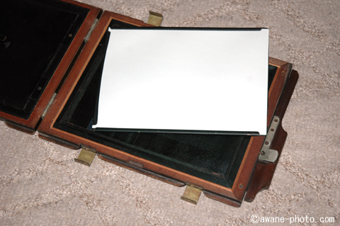 カビネの撮り枠には,両面にシースをセットできる。撮り枠を2つ用意すればそれぞれの両面で4枚の撮影準備が可能となる。