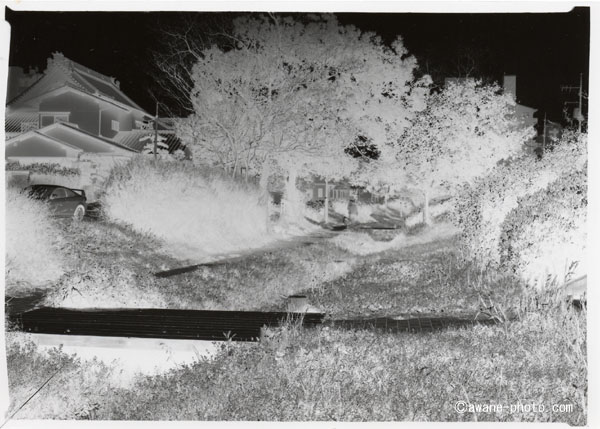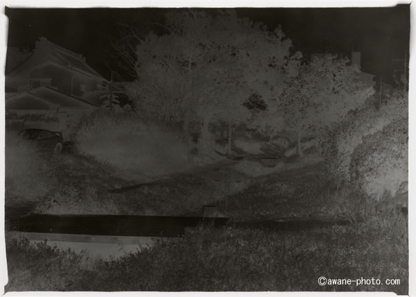 OKUHARA CAMERA, FUJINON W 210mm F5.6, F11 4sec, FUJIBRO WP FM2露光した印画紙を「コレクトール」で現像する。この画像は上から順に,ISO 6,ISO 1.5,ISO 0.4で露光したものである。「コレクトール」の標準的な現像時間は90秒とされているが,ISO 6相当で露光したものは,前回と同様に60秒で現像を打ち切った。ISO 1.5で露光したものは,像が出るのがさらに速く,現像を25秒で打ち切った。ISO 0.4で露光したものは,もう一瞬でまっくろ,という印象である。15秒ほど現像したことになるが,それでも長すぎたようだ。現像時間が短すぎると,現像を打ち切るタイミングがむずかしい。結果として,ISO 1.5相当のものがもっともトーンが出たようであるが,ISO 0.4のものは,現像を打ち切るタイミングを誤ったものとも考えられる。 さて,予備としてISO 3で露光した残りの1枚は,「コレクトール」ではなく,フィルム用現像液「スーパープロドール」(SPD)で処理をおこなうことにした。フィルム用現像液を使えば,印画紙用現像液よりも進行がゆっくりで,現像を打ち切るタイミングを見つけやすいことが期待できるからである。