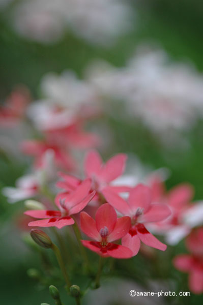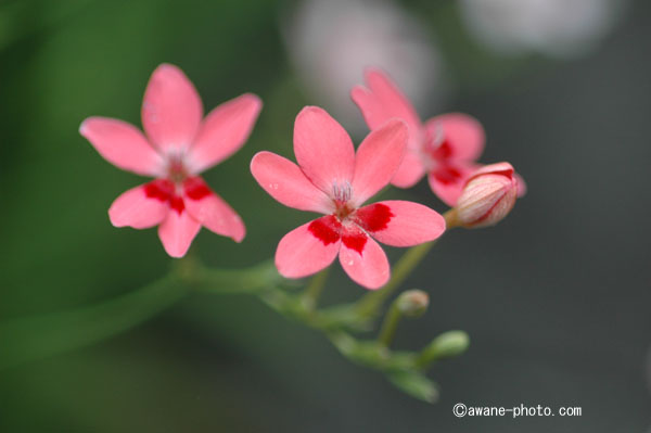 Nikon D70, AF Micro-NIKKOR 105mm F2.8S昨年も書いたように,ヒメヒオウギは繁殖力が旺盛なようだ。昨年こぼれたと思われる種が,予期せぬところから芽を出している。たとえば,ヒメヒオウギを植えた記憶のないプランターや植木鉢,あるいは,地面に敷き詰められたレンガとレンガの間などからも。その葉は一見するとイネ科のいわゆる雑草のようなので,ついつい抜いてしまうのだが,抜き忘れたものからヒメヒオウギの花が咲いているのを見れば,抜いたものの大半は,雑草ではなかったのかもしれない。まあ,そこで花を咲かせたら,そこで種を落とすことになるわけで,ますます必要以上に増えてしまう懸念はある。だから抜いたのが,正解だったのかもしれない。ただ,花が咲く前であれば平気で抜くことができても,花が咲いてしまうとその花があまりに可憐なため,抜くことをはばかられてしまう。 うちにあるヒメヒオウギには,白い花とピンクの花とがある。そしてどちらも,中心付近がやや濃い赤になっている。そのためか,同じ色の花がかたまっているのもきれいだし,2つの色の花が適当に入り乱れているのもきれいだ。