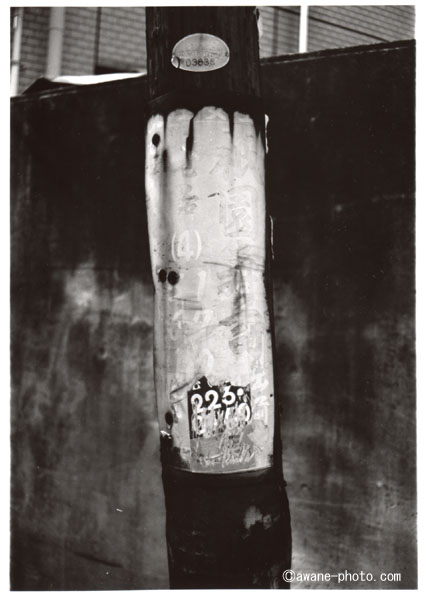 板塀があるようなところには,木の電信柱も残っている。看板に書かれた電話番号は消えかけているが,まだ市内局番が1桁だったころのものであることだけは,なんとかわかる。古くからの町には,このような古いものが残っていることがある。こういうものの存在に気がつくことも,楽しいことである。