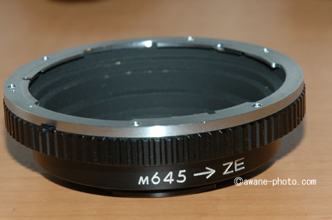 「カメラ総合カタログvol.73」(1982年)を参照すると,「マミヤZE」用にあらたな純正マウントアダプタが用意された。それは「マミヤM645レンズ−ZEアダプターリング」というものだ。「マミヤZE」で,セミ判一眼レフカメラ「マミヤM645」用のレンズを使用するためのアダプタである。自動絞りには連動していないが,「マミヤZE」用の交換レンズのラインアップでは,単焦点の望遠レンズがさびしい状況なので,使える望遠レンズの選択肢を広げるには有効な製品として位置づけられていたことだろう。