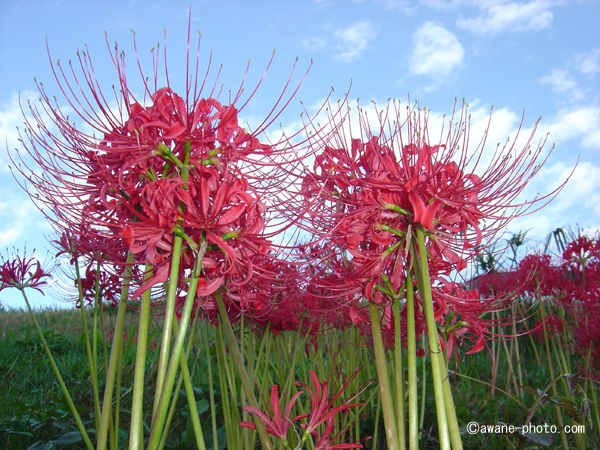 ほとんどの花が開花しているが,開ききって白っぽくなった花はまだ見られない。いずれも,濃い赤を楽しませてくれている。まさにちょうど,撮りごろなのである。例年,9月20日ころまでに撮りごろを迎えるこの土手だが,夏の暑さが厳しいと10月第1週目に撮りごろを迎えることになるようである。