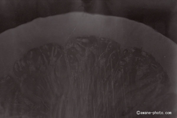 停止液に浸すまでの瞬間に,現像液が流れた跡がムラになったのであろうか。画面中央下部あたりの像が,少し流れたようになっているのが,おもしろい。