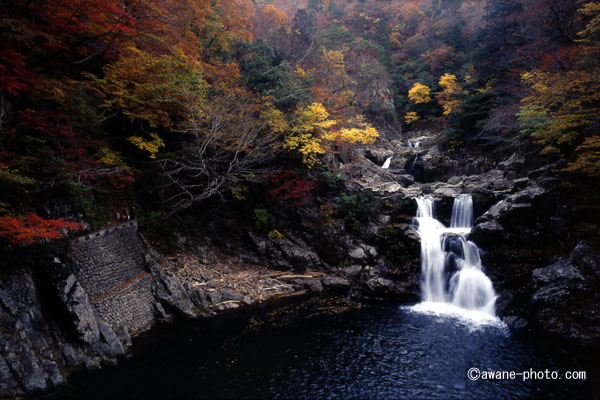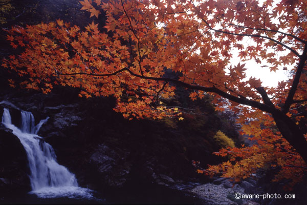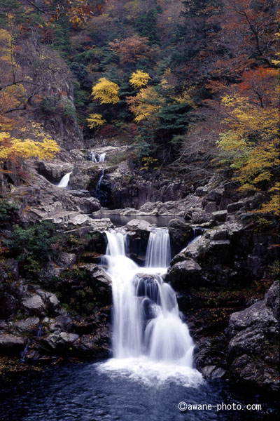 Mamiya Universal Press, Mamiya-sekor 50mm F6.3, E100VS三段滝が,ちゃんと三段に見える位置だから,当然ながらこの展望台から写真を撮る人が多いわけだ。一方,低いところから見るのも,滝と紅葉のバランスがよくて好きである。しかしながら,三段滝が三段に見えないのでは,あまり人気はないのかもしれぬ。