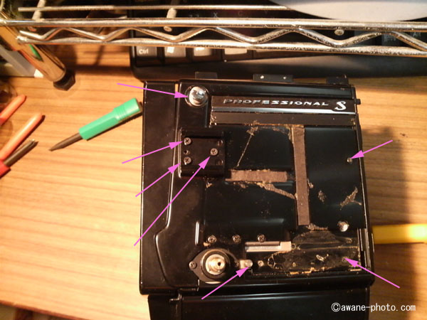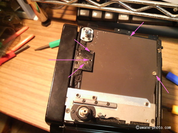 どこから分解すればよいのかわからないが,見えているネジはすべてはずしてしまおう。ところが,見えているネジはない。こういうときに,ネジが隠れている場所は,だいたい決まっている。まずは,貼り革の下。アクセサリシューの下。そしてRB67の場合は,ストラップ取付金具そのものもあやしい。案の定,アクセサリシューの下には3つのネジが,貼り革の下には3つのネジが隠されており,さらにストラップ取付金具をはずせば,側板がはずれたのである。