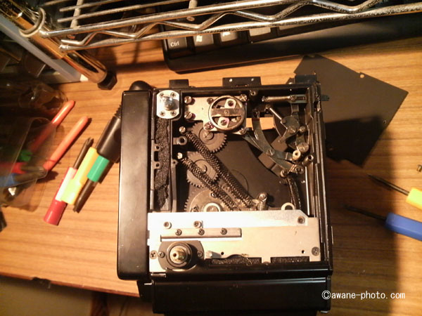 動かなくなったRB67を眺めてみると,モルトプレンのかけらが出てきた。もしかすると,これがメカ部に詰まってしまっただけではないだろうか。そうであれば,メカ部をちょっと掃除するだけで,直るのではないだろうか。もし直らなければ,また,安価な中古品を見つければよい。さっそく,分解することにしよう。