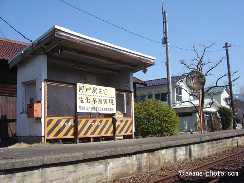 駅舎もなく,ホームにちょっとした待合所があるだけの簡素な駅だが,待合所に入れないように封鎖されているだけで,そのほかは驚くほどきれいに,現役当時と変わらぬ姿で残っている。「河戸駅まで電化早期実現」という看板もあり,地元の人たちによって維持・管理がなされているのだろう。