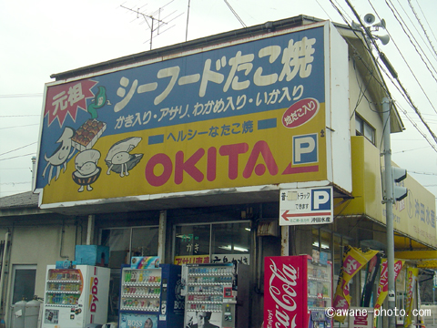 看板をよく読めば,「カキ,アサリ,ワカメ,イカ」が入った「たこ焼き」ということらしいとわかる(なぜ,「アサリ」だけ「アサリ入り」ではないのかは,謎であるが)。さらに「地たこ入り」とある。「たこ焼き」に不可欠な要素である「タコ」にくわえて,さらに「カキ。アサリ,ワカメ,イカ」が入っているということのようだ。どんなものなのかは,立ち寄って食べてみればおのずとわかるはずだが,今日も「先を急いでいる」ので悪しからず。