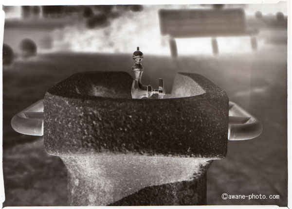 OKUHARA camera, FUJINON W 210mm F5.6, FUJIBRO WP FM2昨年の結果から,印画紙で撮影するときにはその感度をISO3相当とみなし,ややオーバー気味で撮影をおこなった。そして,印画紙用の現像液ではなく,フィルム用の現像液で現像をする。フィルム用の現像液を使うことで,現像の進行がゆっくりになるため,ほどよいところで現像を止めやすくなるためである。