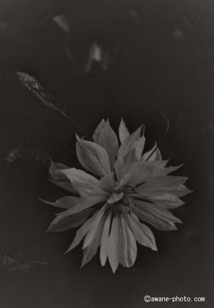 OKUHARA camera, FUJINON W 210mm F5.6, FUJIBRO WP FM2, FUJIBRO WP FM2同じ被写体で,ふつうの現像をおこなったものをつくらなかったので,ソラリゼーションの効果がよくわからない(笑)。これは,まあ,単純なミスというかなんというか。被写体は鉢植えのクレマチスなのだが,すでに花はしぼんでしまっている。剪定して,次の花が咲くのを待つことにしよう。 |