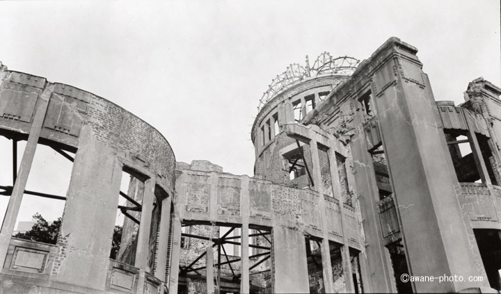 つぎはすこし場所を変えて,川へ降りる途中から見上げてみた。スイングアオリを使いたい場面であるが,古典的な組立暗箱ではフロントライズを除いてアオリ機構は用意されていない。とはいえ各部分に多少の「遊び」があるような組立暗箱なので,気持ちほどはアオリが可能である。これは「長所」というよりも,工作精度がいまひとつという「短所」なのかもしれないが(笑)。気持ちほどだがアオリを効かせ,さらに思いっきり絞りこむことで,手前の碑にも,奥の原爆ドームのレンガにも,だいだいピントがあって見えるようになった。