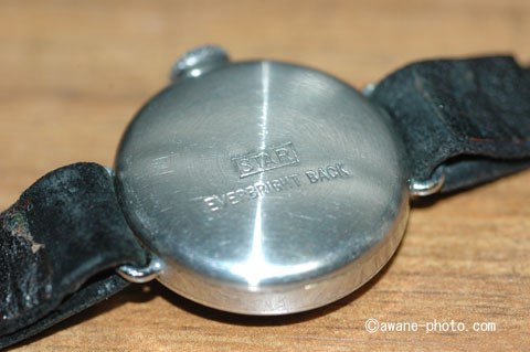 裏蓋にあるのは,「STAR」という文字だけだ。ではこの「STAR」とはなにか?これは,シチズンの純正ケースを示す文字である。「国産腕時計2 シチズンデラックス」(岡田和夫,トンボ出版,1997年)によると,「1932年にスター商会を合併することによってできた,ケース製造部門が作った純正ケース」であることを示しているとのこと。シチズンは,セイコーにケースを供給していたことがあったということか?いや,これは,ケースのサイズがたまたま一致していたので,修理等のときに流用されただけと考えるのが自然だろう。