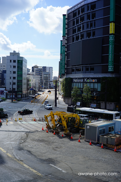 2025年10月05日(日) 天気:晴お散歩でNOKTON classic 40mm F1.4お散歩しながら,目についたものをお手軽に撮る。そういうときは,ライカ判で40mmくらいの焦点距離のレンズが使いやすいと思っている。35mmより短い広角レンズだと,あまり考えずに撮ると散漫なものになりがちである。もっともこれが,20mmよりも短い超広角レンズになると,なにを撮っても非日常的に見えてくるのでおもしろい。ただし,その日に撮ったものがすべてワンパターンなものになりがちなので,たまにレンズを交換して使う程度にとどめたいものである。逆に,50mmより長焦点のレンズだと,なにか気になるものを見つけたときに,それなりに下がらないと思った範囲を写せないことになる。たとえば花であるとか小物であるとか,それなりに被写体に近づいて撮る場合であれば,周囲や背景に余計なものが写りこまなくて都合がよいのだが,それなりに下がって撮ることになると,被写体との間に余計なものが写りこんできたり,背景の写りこみが中途半端なものになって落ち着かない。また,被写体に近づいて撮るならば,最短撮影距離が問題になる。すると接写用のマイクロレンズを選ぶことになり,これはこれで撮るものがワンパターン化してしまう。 今日のお散歩は,路面電車乗り場があたらしくなった広島駅からはじめることにした。開業前日には,旧来の広島駅前に至る線路にはまだ電車が運転されていた(2025年8月2日の日記を参照)が,あたらしく広島駅の2階に乗り入れるようになったことで線路が付け替えられている。そして現在は,旧来の線路を撤去する工事が進められている。線路を撤去したことによって生じるスペースは,狭かった歩道の拡幅に利用される予定とのことである。なお,このあたりは以前から,中古カメラ店が集中している場所としてよく知られていた。旧来の線路はこの先をつきあたったところを右へ曲がっていくが,そのつきあたりにも1件のカメラ店「オーロラカメラ」が営業している(2009年3月4日の日記を参照)。