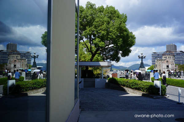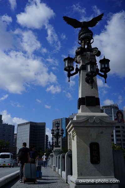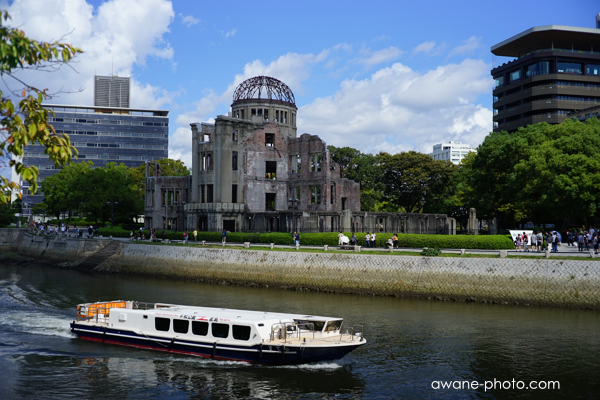 SONY α7, NOKTON classic 40mm F1.4 MC旧・西国街道ということは,かつてはいちばんのメインストリートだったわけである。そしてこの橋は,広島の市街地への入り口にあたるともいえるわけで,それにふさわしい豪華な橋としてつくられたのであろう。現在では,比較的人通りが少ない状況ではあるが,広島駅に2階に乗り入れるようになった電車のルートと並行しているので,今後あらためて注目されるようになるのではないだろうか。 この道をさらに西に進み,広島電鉄の白島線につきあたったところで南へ進む。そして,アーケード街になっている本通商店街へ続く道が,旧・西国街道に該当する。本通商店街の路面には,そこが旧・西国街道に相当する道であることを示す表示もあるので,訪れたならさがしてみるとよい。 この道をさらに西へ進むと,平和記念公園に至る。まだまだ暑い日が続いているが,それでももう10月である。いちばん猛暑だったころよりは,いくぶんか過ごしやすくなっている。外国からの観光客と思われる人の姿も多く,人が多く写りこまないような構図やタイミングをとらえるには,1箇所にある程度は腰を据えている必要がある。とはいえちょうど目の前を,平和公園と宮島とを結ぶ船が通過したなら,それはとっさにでも写しておきたいものである。