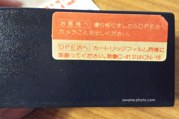 「お客様へ 撮り終わりましたらDPE店へカメラごとお出しください」という文言からは,このカメラはフジの「写ルンです」と同じようなものであることがわかる。これは,「DPE店へ カートリッジフィルム同様に取扱ってください。」という文言からもわかる。また,それに続いて「現像C-41又はCN-16」とあることから,このカメラに装填されているフィルムが,カラーネガフィルムであることもわかる。