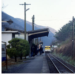 さて,7時過ぎに,加計行き列車から「安芸亀山」駅に降りた人は,私一人であった。かわりに,おばあさんが一人乗り込んで行ったが,駅にはほかにまだ誰もいない(このとき,そのおばあさんの家族と思われる人がやってきて,「今の列車におばあさんが乗りませんでしたか?」と尋ねられた。伝言かなにか,忘れものがあったのだろう。)。やがて,1人,2人と,人が集まってきた。最後は,15〜16人くらいになっただろうか。そして,7時32分,定刻どおりに可部行きの列車がやってきた。2両編成のディーゼルカーには,座席がほぼ埋まる程度の乗客がいた。