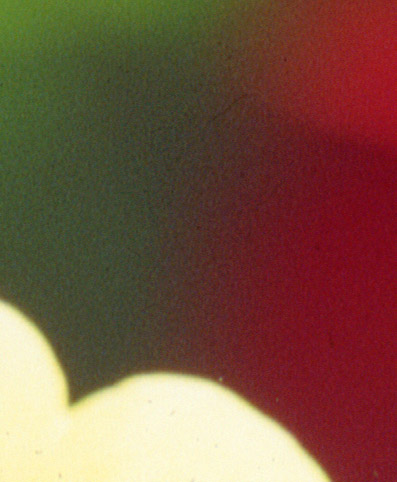 次の画像は,上の画像の,黄色い花弁と赤い花弁が重なるあたりを拡大したものである。使用したスキャナはEPSON GT-9700Fで,2400dpiで読みこんだものの一部である。家庭用スキャナによる読みこみのため,厳密な判断はできないともいえるが,かなり明瞭な差が認められるだろう。