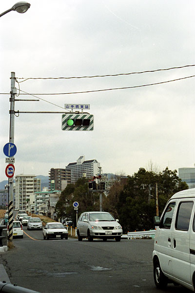 シグマ1000mm F13.5の試し撮りをする前に,完成した「緑のRTS」の試運転をおこなってみた。いつものように,太田川放水路の土手を散歩してみる。山手橋は,最近,新しく架けかえられた。ここにある信号機には,緑色のストライプの枠といえばいいのだろうか,こういうものがついている。