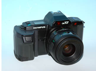さて,OM707の使い心地はどうだろうか。まず最初に感じることは,握りやすさである。このグリップは,そういう面では非常によい。大きさ,深さもちょうどよく,どちらかというと前面にあるシャッターレリーズボタンの位置も,絶妙である。フラッシュが内蔵されている分,幅があることも,よい面にはたらいているのであろう。見た目には,かなり長細いスタイルになる。ペンタプリズム部が低いため,実に細いカメラに見えるようになっている。