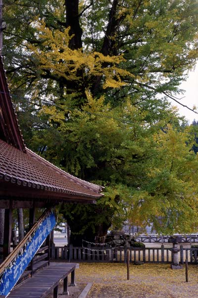 大イチョウは雄株であり,ギンナンをつけることはない。社殿の奥にあるイチョウは雌株であり,こちらは盛大にギンナンをつける。ちょうど,ひとしきりギンナンが降ったあとでもあり,上記の写真を撮った位置の周辺は,散乱したギンナンの香りに包みこまれていた。