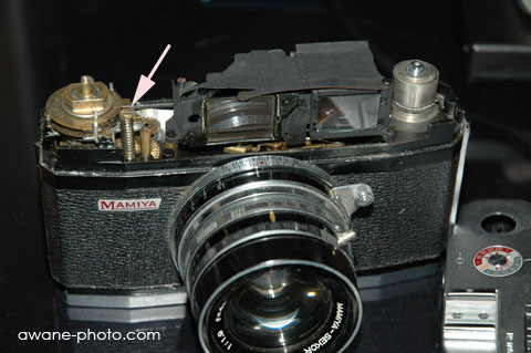 矢印で示した部分を,シャッターレリーズボタンが押し込むことによって,巻き止めの解除とシャッターを切る動作がおこなわれる。そして,この部分は,ネジになっている。試しに,この部分が長くなるようにネジを回転させ,元通りに組み立てた。 チャッ シャッターは無事に切れた。ピントリングを何度も往復させながら,シャッターレリーズボタンを押しこむことを繰り返した。今度は,どこにあっても,スムースにシャッターが切れる。ようやく,ちゃんと使える状態になったわけだな。ピントリングの位置,すなわちシャッターユニットがボディからどれだけ離れているかによって,やはりシャッターレリーズボタンのストロークが違うことが,あらためて感じられた。 何度もピントリングを往復させたのだが,やはりこの動きは固いまま,さほど変化が起こらないのであった。 |