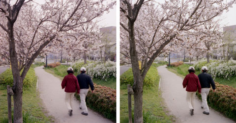 Kodak Stereo Camera, 35mm F3.5, GOLD100立体視することで,どの枝がどれだけ手前にあるか,どちらの枝がより手前にあるかなどが,判別しやすくなっている。下の方の枝が手前に突き出していることは立体視しなくても想像できるだろうが,上の方の枝にも,手前に突き出しているものがあることは,立体視しなければ,なかなか判別できないだろう。 さて,このようにしてサクラを撮っていると,人の生活する場に近いところにある木だから,どうしても通りすがりの人が写りこんでしまうことがある。ほどよい距離を保ってきた,人とサクラの長い関係がうかがえるわけだ。しかし,立体視すると,この人たちの数歩先に落ちている石ころが,たいへん気になってしまうのであった。