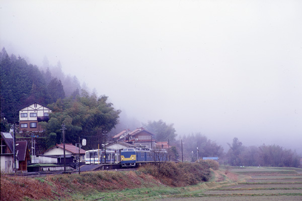2006年04月16日(日) 天気:晴キリの中でキヤに出会う広島市内のサクラの季節は,ほぼ終わった。いまは,広島県北部のサクラが満開の時期である。今日の天気予報は晴れ,昨日の大雨がウソのようである。 大雨の翌日なら,川の霧が濃いことが期待できる。濃い霧のなかの常清滝など撮ってみようかと思うが,この時期は,雪もなければ新緑もない。あまりおもしろみのない時期である。とりあえず,高北広域農道を経由して式敷まで行ってみると,江の川の霧がたいへん濃く,少し向こうの山はほとんど見えない状況である。そこで,霧に覆われた山を背景に,早朝の三江線の列車を撮ってみることにした。