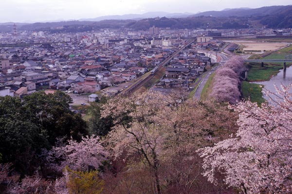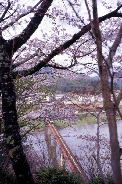 Mamiya Universal Press, Mamiya-sekor 250mm F5, E100VSこのあと,国道375号線を通って,尾関山へ向かった。尾関山のサクラと,三江線の組み合わせを撮ってみたかったからである。この場合,撮り方としては,2通りのものが考えられる。