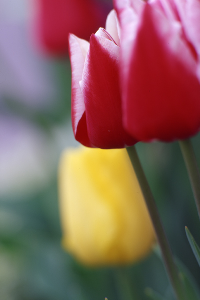 2006年04月18日(火) 天気:晴マミヤプレスでチューリップを接写するこの春も,自宅で植えたチューリップは咲いてくれた。今年は20本近く咲いたわけだが,すべてが一斉に咲いてくれたわけではなく,すでに花を落としたものもある。いろいろ撮っておこうとは思っていたものの,雨が降る日があったり,風の強い日があったりで,ほとんど撮ることができていない。 一般に,花を撮るとき,「中望遠マクロレンズ」とよばれるタイプのレンズを使うことが多いだろう。それらは被写体に30cmくらいまで接近し,「等倍撮影」ができるものが多い。「等倍」というのは,フィルムに被写体が実物大で写しこまれることを意味している。被写体の大きさが1cmであれば,フィルム上にも1cmで写しこまれている,ということだ。このような撮影は,いわゆるレンジファインダー式のカメラでは不可能な撮影領域であり,一眼レフカメラを使うのが適している。それは,撮影するレンズを通してフィルム面に写る像をファインダーで確認できるからにほかならない。 さて,自宅のチューリップを撮影する場合,背景がすっきりしないので,望遠マクロレンズを使いたい。しかし,マミヤプレス用に,望遠マクロレンズのラインアップはない。マミヤプレスは,ビューカメラとして使うこともできるが,本来はその名称が示すように「プレス」カメラ,報道用の速写カメラなのであり,ボディに内蔵された距離計連動ファインダーを使って構図を決め,ピントを合わせて撮影するようにつくられたカメラなのである。