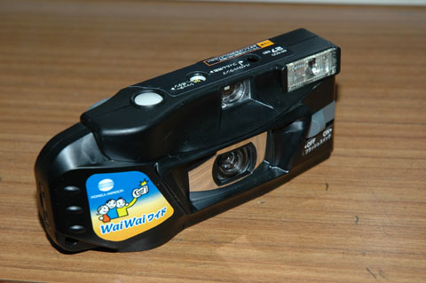 そのような超広角レンズは,被写体にぐぐっとよって遠近感を強調したアングルを試すことができ,たいへんおもしろいものである。そのような超広角レンズをお手軽に体験できる,そんなレンズつきフィルムも商品として流通している。それは,コニカミノルタの「撮りっきりコニカMINI WaiWaiワイド」(以下「WaiWaiワイド」)である。「WaiWaiワイド」は,17mmレンズを搭載したレンズつきフィルムで,ピントが合う範囲は,0.4m〜∞となっており,超広角レンズ特有の,被写体に迫った撮影も楽しめるようになっている。もっとも,このレンズつきフィルムが超広角レンズを搭載しているのは,「腕を伸ばして,自分と背景を一緒に写しこむ」(これをメーカーでは「自分撮り」と表現している)ためのようだ。