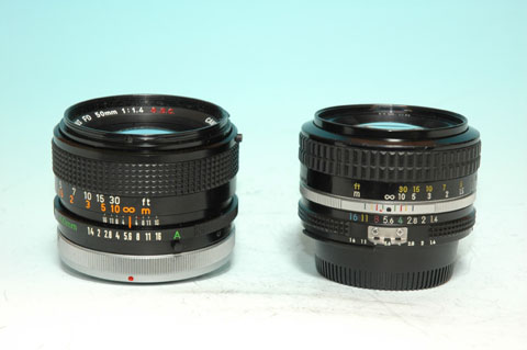 左:キヤノンFDマウントレンズ,右:ニコンFマウントレンズピントリングを回す向きは,そのメーカーのシリーズの中では,ほぼ統一されているようだ。一方,さまざまなメーカーのカメラ用レンズを供給する,いわゆるレンズメーカー製のレンズの場合,純正レンズと回す向きをあわせている製品群もあれば,そうではない製品群もあるようだ。純正レンズと変わらない感覚で使えるようにして商品価値を高めるためには,純正レンズと向きをそろえることになるだろう。一方,それにこだわらないことで,コストダウンを実現することを狙った製品群もあるだろう。
