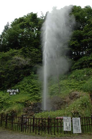 2006年06月18日(日) 天気:くもり鬼首温泉へ行く「温泉に入りたい。」 鬼首の温泉街に近づくと,「かんけつ泉」という看板が目に入ってきた。間歇泉とは,ある程度の時間をおいてお湯が吹き出すものである。とりあえずそれを見物するべく,看板にしたがって進んでいった。