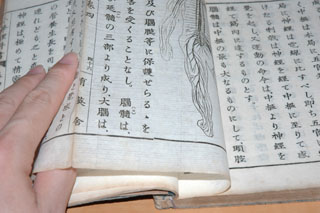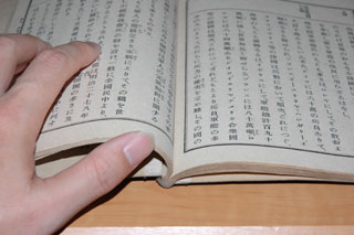 「尋常小学読本 巻八」は,和紙に木版刷りされ,袋とじにして糸で製本された,いわゆる「和装本」である。木版刷りとは,2ページ分の紙面にあたる凸版(凸部分にインクを載せて印刷するときの原版)を木の板に彫り,それを版画の要領で半紙に印刷する手法である。版画と同様にバレンで紙を擦る動作が含まれることから,「木版刷り(すり)」とよばずに,「木版擦り(すり)」とよばれる場合もあるらしい。ところで,もともと木版刷りでは,版の元になる字は手書きによるものである。しかし,この教科書では,1つ1つの文字の形がそろっており,きちんとした楷書になっている。そのため,元になる字は,活字が使われているのかもしれない。