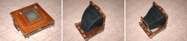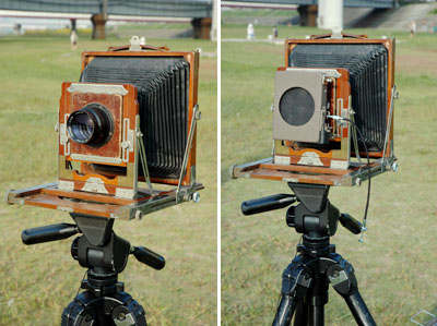畳まれた状態から,リアのボードを起こし,次にフロントのボードを起こす。このように,使うたびに組み立てるところから,組立暗箱とよばれるようになっている。暗箱とはいうまでもない,感光材によぶんな光があたらないよう,カメラというものはなかが「まっ暗」な箱であることを意味している。