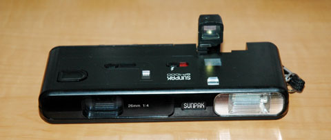 このカメラは,サンパック「SP−1000」という。サンパックというと,エレクトロニックフラッシュのメーカーとして,よく知られているだろう。しかし,そこにあるのはカメラである。たしかに,カメラにフラッシュが内蔵されているのは珍しくないのだから,フラッシュのメーカーがカメラを発売してもおかしくないのかもしれない。いっしょにいた友人たちも,「サンパックのカメラというものは,はじめて見た。」という。価格は1300円であり,このクラスのカメラとしては,高いといえる値段がつけられている。しかし,「サンパックのカメラ」というものは,立派なハナシのネタになるはずだ。ネタとしてなら,この価格も許容範囲だろうと考えて,購入することにしたのである。