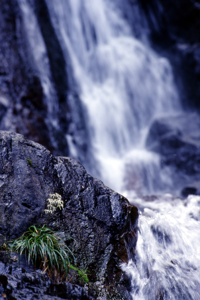 ここは,背景に滝の流れが見えていることや,岩の表面が濡れていることからもわかるように,しぶきがかかりやすい場所である。また,水流による風も常時あり,背丈の小さな花であるが,花茎の先に広がった花は,必ずしも静止していない。だから,花が静止するタイミングをみはからってシャッターをレリーズすることになるが,可能な限り露光時間は短くしたい。されど,ここは薄暗い場所であり,開放では花自身にピントが十分にこないだろう。また,できるだけ露光時間を長くして,背景の水は,流してしまいたい。結局,どれだけの露光時間を与えたのかは覚えていない(面倒なので,いちいちメモなどをとっていない (^^;)のだが,まあ,期待した結果にはなっている(ここで「まあ,いいか」ではなく,さらにベストを追い込むのが,正しい撮影に対する姿勢であろうことは,アタマではわかっているのだが (^^; まあ,許せ)。