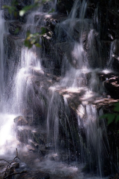 ともあれ,黒淵を過ぎてしばらく歩くと(長淵橋から約3km),右手(左岸)側におよそ1kmにわたって多数の小さな滝がみられるようになる。その間に,雌滝,雄滝と名づけられた比較的大きな滝が見られるが,それ以外の滝には,とくに名前をつけて紹介されることもないのだろうか,名札等が見られない。それらの滝は,1つ1つ表情が違っていておもしろい。そんな滝の1つが,この写真である。