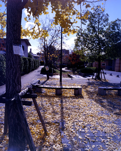 さて,このイチョウの黄葉を逆光で透かしつつ,地面に広がる落ちた黄葉も同時に撮ってしまおうと考えた。これまで出番の少なかった,Fujinon SWD 90mm F5.6の登場である。このレンズは,入手したときにはきっと出番が多くなるだろうと思ったものだが。。。。。