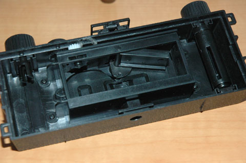 この仕切り板をはねあげることで,2コマ分の「パノラマ撮影」が可能になる。もっとも,パノラマ写真の愛好家の方なら,「ヘッドがくるっと回転するタイプのカメラで撮ったものだけが,真のパノラマ写真である。」などと主張されているかもしれない・・・・。 |