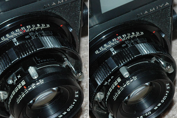 ところで,「マミヤプレススーパー23」でアオリ機能を使うとき,フィルムホルダの位置が,通常よりも数cm後に下がることになる。そうすると,そのままでは無限遠にピントがこない。そのため,標準レンズ「マミヤセコール 100mm F3.5」には,沈胴機能が用意されている。鏡胴を回して押しこめば,鏡胴が短くなるわけで,アオリ機能を使うときにも無限遠にピントをこさせることが可能になるのだ。もちろん,そのときには,距離計は連動しない。ピントグラスを使ってのピント調整が必須になる。