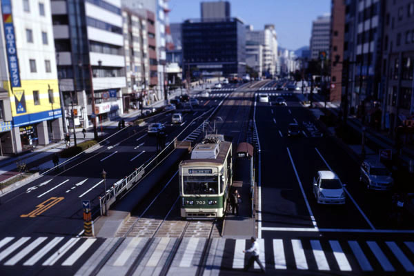 さて,紙屋町方面からの電車は,たいてい,この本川町電停で信号にひっかかる。信号にひっかかった瞬間を利用して,ピントやアオリを調整する。ほぼ信号がかわるごとに電車がやってくる状態だから,こういうことも可能なわけで,もしこれが,1時間に1本しか電車がこない,という場所であれば,こんなのんびりした撮り方はできないだろう。
