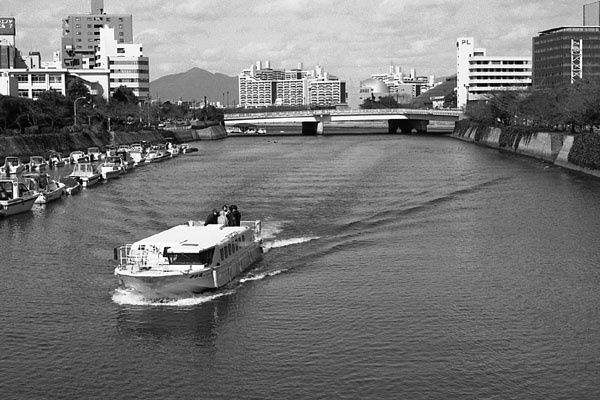 Yashica CONTAX RTS, Tessar T* 45mm F2.8, 100DELTA相生橋の下からあらわれた「きらら」後部のデッキには,何人かの人が出ていて,川からの眺めを楽しんでいるようだ。 |
