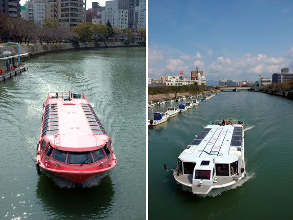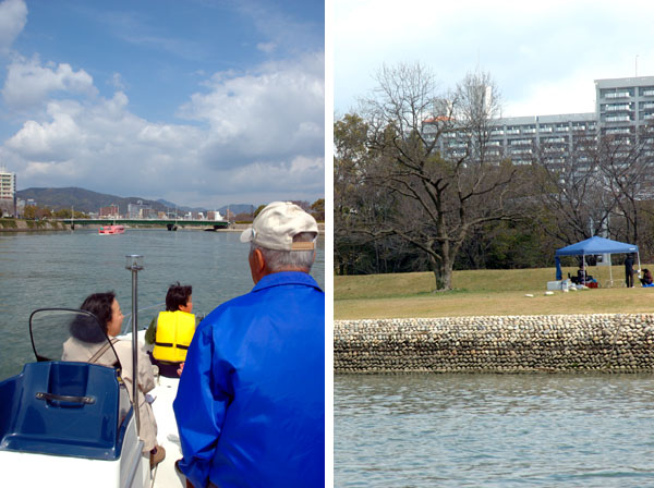 Nikon D70, AF-S DX Zoom-NIKKOR ED18mm-70mm F3.5-4.5G結局,平和公園まで歩いても,開花しているサクラに出会うことはなかった。サクラがいないのではしかたがない。ついつい,川を行く船にカメラを向けてしまうのである。今日も,「すいすい」のほか「るんるん2」「きらら」や,雁木タクシー,さらには「花見船」までさまざまな船が,多くの人を乗せて行き交っている。これはまさに,広島の特徴的な光景と言っていいであろう。
