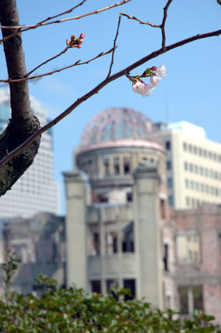 Nikon D70, AF-S DX Zoom-NIKKOR ED18mm-70mm F3.5-4.5G平和公園に戻ってみると,原爆ドームの対岸のサクラに,開花した花があるのに気がついた。今朝からずっと,ひそかに咲いていたのだろうか。それとも,いま開いたばかりなのだろうか。そのあたりは,わからない。ともあれ,これを撮って,ふたたびPOP'La通りの方へ歩いて戻ることにした。
