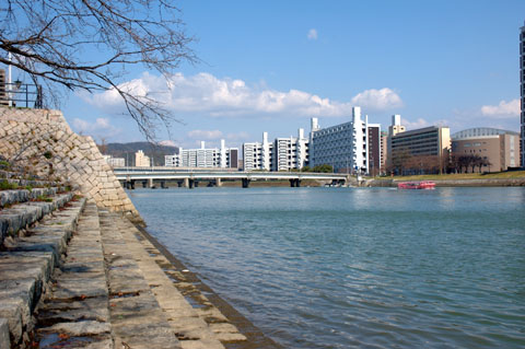 2007年03月25日(日) 天気:曇のち晴サクラはまだかいなこの冬は,記録的な暖冬であった。そのため,「今年のサクラは,例年になく早く開花する」と囁かれていた。しかし,その一方で,「十分な寒さを経ていないので,むしろ開花は遅くなる」と見る人もあった。気象庁による3月7日の発表では広島の開花予想日は3月25日,同じく3月14日の発表では3月26日であった。しかし結局,3月22日に広島での「開花宣言」が出たわけである。なお,ここでいう「開花」とは,花が5〜6輪咲いた状態を指し,開花から満開までは約1週間とのことである。 横川から本川沿いの右岸を歩き,空鞘橋を渡って左岸に移る。ちょうど,先々週に歩いたのと同じようなルートである。このあたりには,「基町POP'La通り」という名前が与えられているが,まだあまり知れ渡ってはいないようだ。このあたりのサクラは,花芽がかなりふくらんできているものの,開花にはいたっていないように見える。そのときちょうど,リバークルーズの「すいすい」が通りすぎていった。