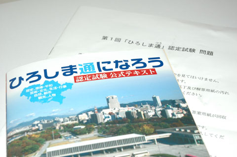 認定試験問題冊子と公式テキストそれほど「やさしい」のであれば,この「認定」を受けたからといって,「ひろしま通」を名乗るほどのことではないかもしれない。ところで,この認定試験について,主催者は『広島の歴史・文化・自然などの魅力を知っていただき「ひろしまファン」を増やしていくために実施します。』と述べている(※2)。広島以外に住んでいる人を対象に,広島について興味・関心をもってもらうことを目的としているのであろう。そうであれば,「広く」「浅く」感じられる出題にも,納得がいくというものである。試験会場では,同時にアンケート用紙も配布された。それには「より上級の試験があれば受験したいか?」という意味の問いもあり,まさに「エキスパート」と呼んでもいいような人の認定も考えているのであろうとうかがい知ることができる。そのことからも今回の認定試験は,あくまでも「広島に興味をもってもらうきっかけ」という位置づけとして設定されているのであろうと考えられる。