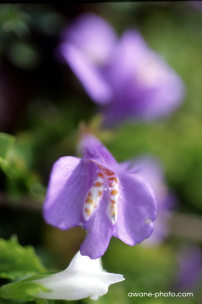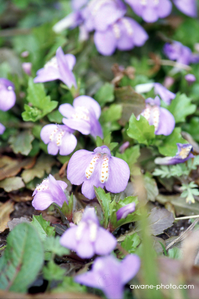 Nikon F3, AF Micro-NIKKOR 105mm F2.8S, EBこれは,「サギゴケ」と呼ばれる花のようだ。コケのように地面をびっしりと覆い,「ゴケ」という名前がついているのであるが,コケの仲間ではない。このように紫色の花のものは「ムラサキサギゴケ」と呼んで,白色の花のものと区別することもあるとのことである。おもしろいことにこのあたりでは,白い「サギゴケ」と「ムラサキサギゴケ」が混在していない。きれいに群落が分かれている。上の写真のように,白と紫が隣接しているところは,あまり多くないのである。地面をびっしりと覆ってしまうことから,自分の群落以外の植物をその場所から締め出してしまうのだろうか。