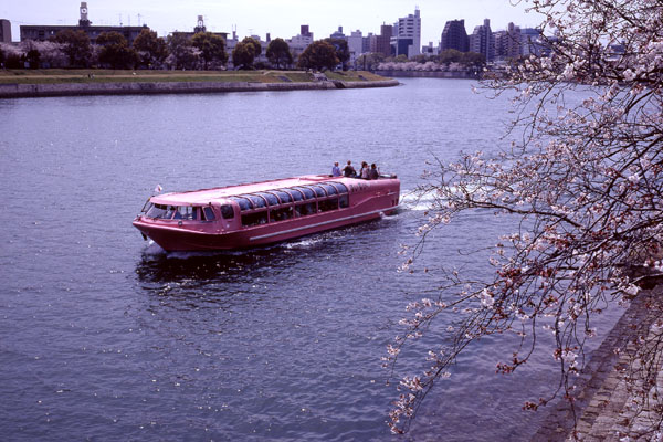 Mamiya Press Super23, Mamiya-sekor 100mm F3.5, E100GPさて,「すいすい」が運行される川の両岸には,サクラ並木がある。川からこれらのサクラを楽しめるよう,この時期の「すいすい」は,サクラの木の近くを航行する。たとえば,「楠木の大雁木」のところでは,水位などの問題がなければここまで近づいてくるのだ。