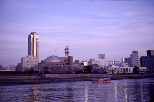 Mamiya Universal Press, Mamiya-sekor 100mm F3.5, EPN下流側から右岸のサクラをながめつつ「楠木の大雁木」へ接近してきた「すいすい」は,このあと三篠橋東詰付近のサクラを楽しめるように,左岸の方へ移動していく。この写真は,お昼休みの時間帯に「楠木の大雁木」にやってきた「すいすい」である。 夕暮れがせまってくると,空の色が変化しはじめる。だんだんと深い色になりながら,その間に,強い夕日の色があらわれたり,さらには人工光の色があらわれたりする。そんな夕方にも,「すいすい」はサクラを求めて川を行き来している。ちょうど「すいすい」の向こうでは,広島市民球場でナイターがおこなわれているのであった。