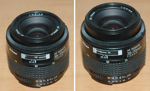 AF Zoom-NIKKOR 35mm-70mm F3.3-F4.5Sでは,0.5mまでは距離目盛が入っている(左)が, それよりも近接時は「マクロ域」として距離目盛が入っていない(右)。